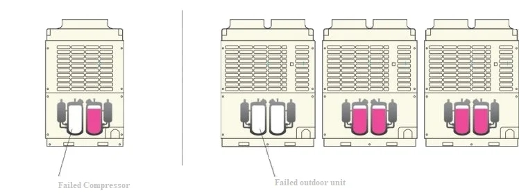 - Tính năng dự phòng (Back-up): Nếu một đơn vị trong tổ hợp gặp sự cố, đơn vị còn lại vẫn có thể duy trì hoạt động để không làm gián đoạn việc làm mát/sưởi ấm của tòa nhà.